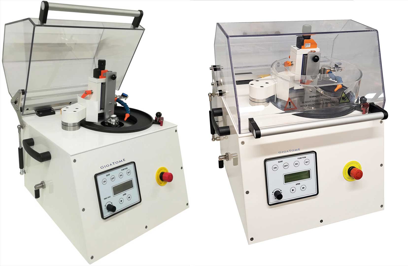 - Small footprint table microtome with small intuitive control unit with integrated touch screens and high precise knobs and turning wheels
